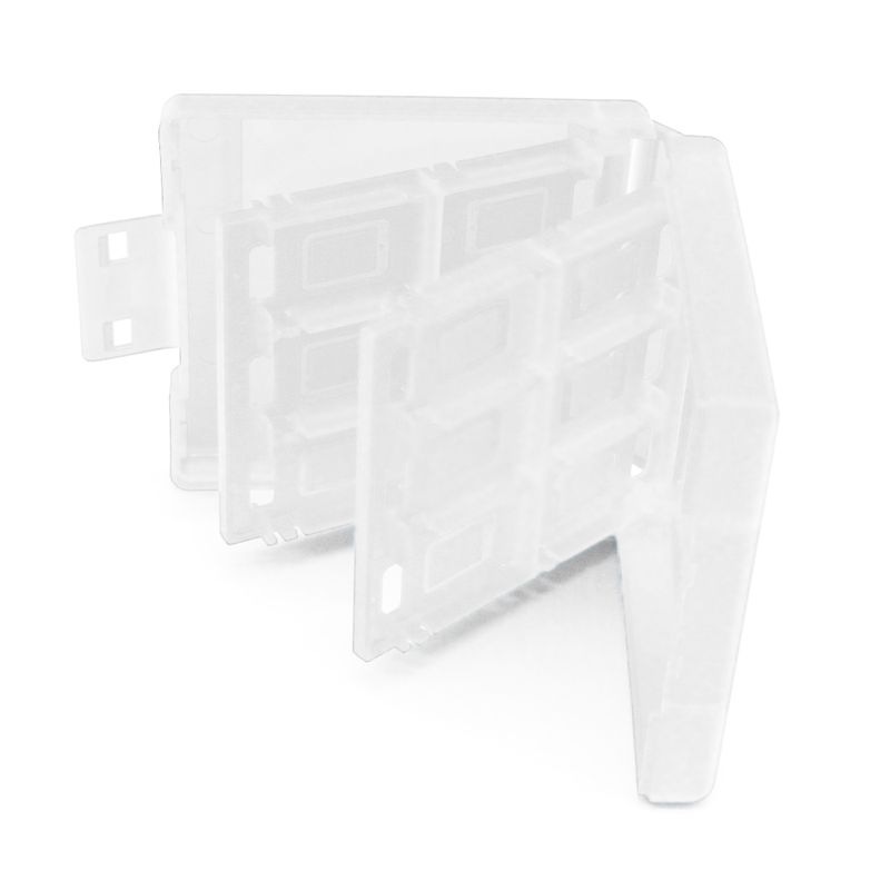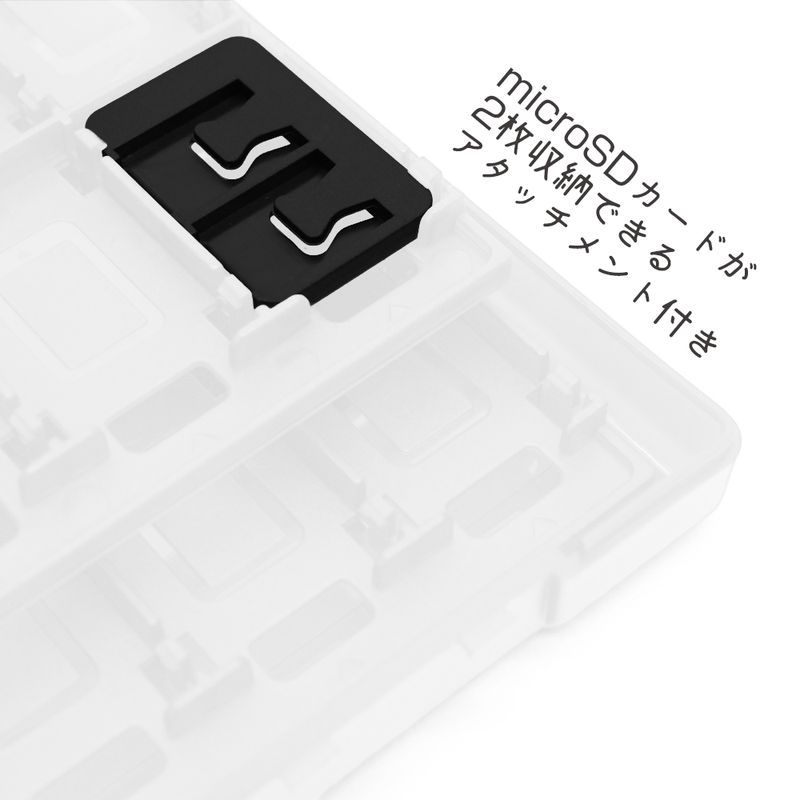 収納ケースは、8枚、12枚、24枚用があります。任天堂スイッチのゲームカードと、MicroSDを2枚収容することができます。カラーバリエーションは、白、青、黒の3色をご用意しております。