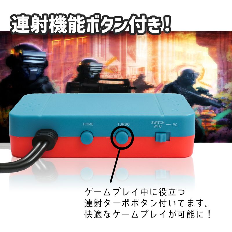 変換アダプタにはホームボタンや連射ターボボタン付きとなっております。ホームに戻る際にわざわざコントローラーを変える手間は必要ありません。さらに、ゲームプレイ中に役立つ連射機能ボタンも付いているのでとても便利です。これらの機能により、快適にゲームをプレイすることができます。