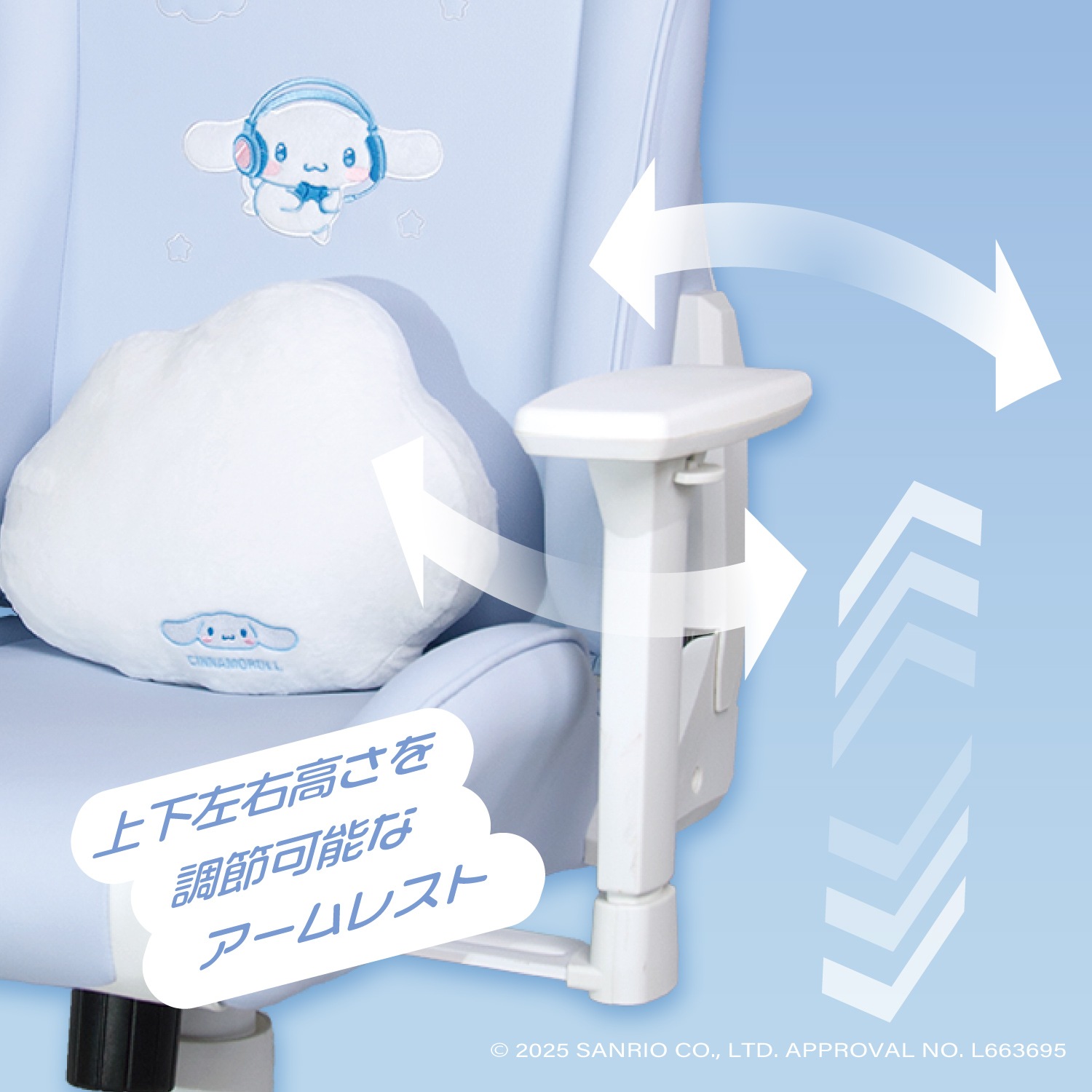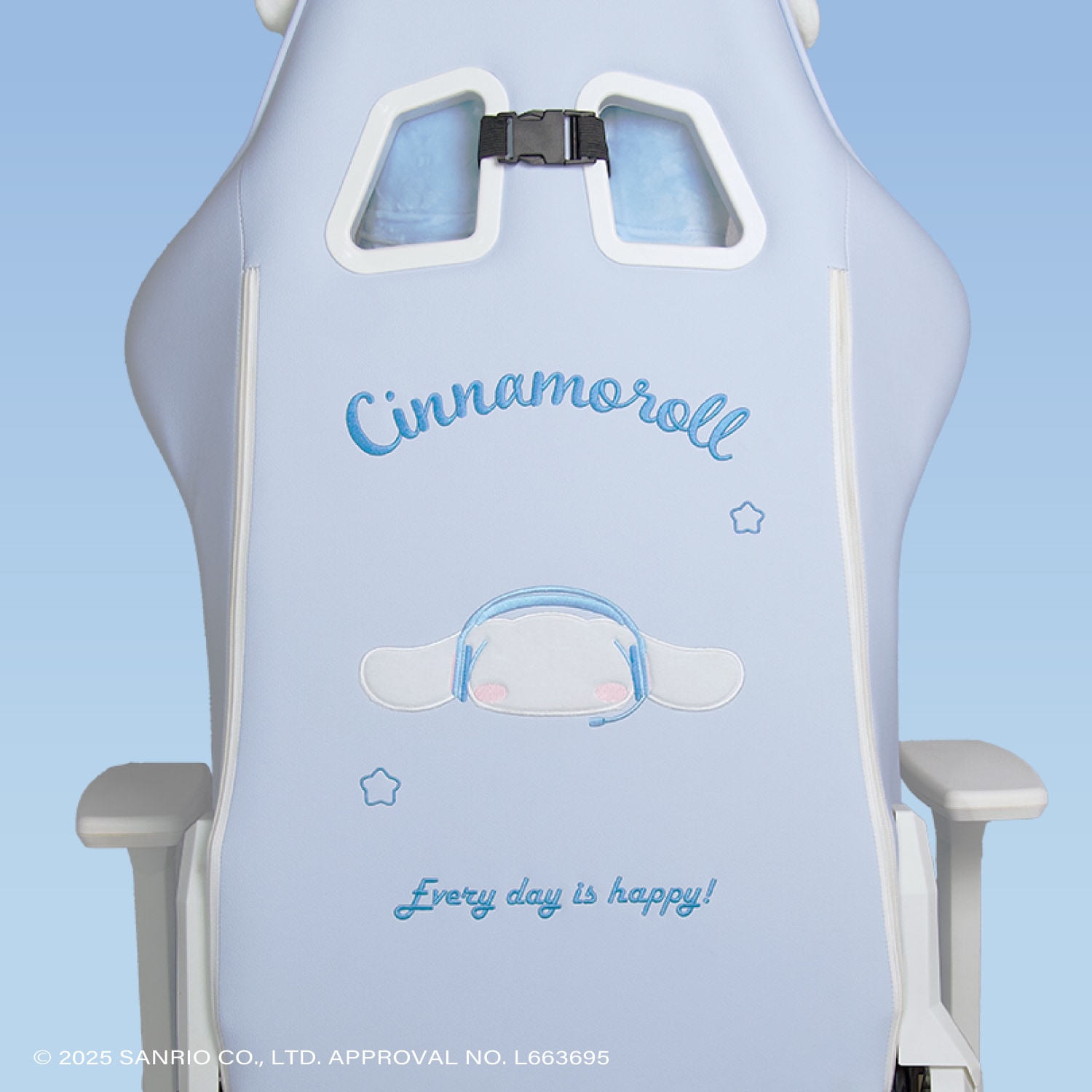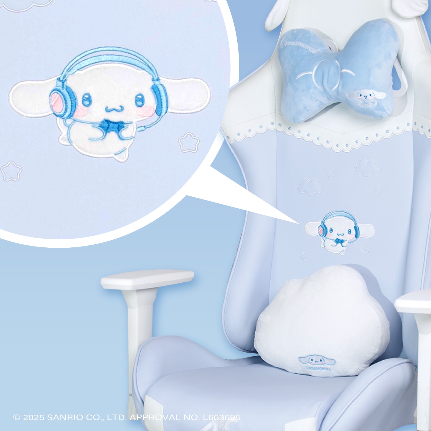 サンリオキャラクターズ「シナモロール」をイメージしたゲーミングチェアです。カラーリングから刺繍まで、すべてシナモロール仕様となっております。